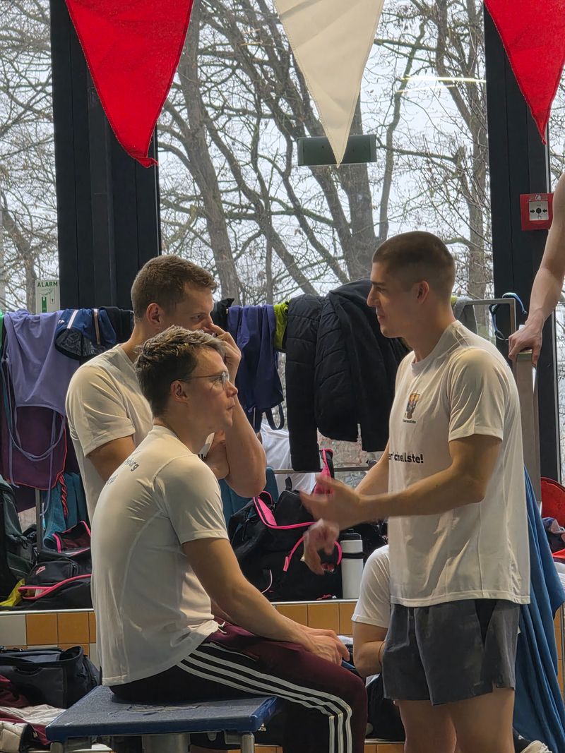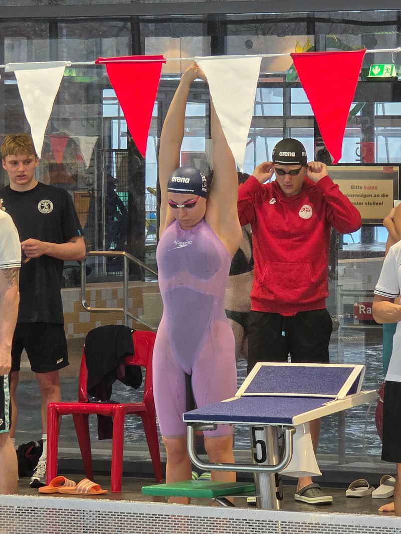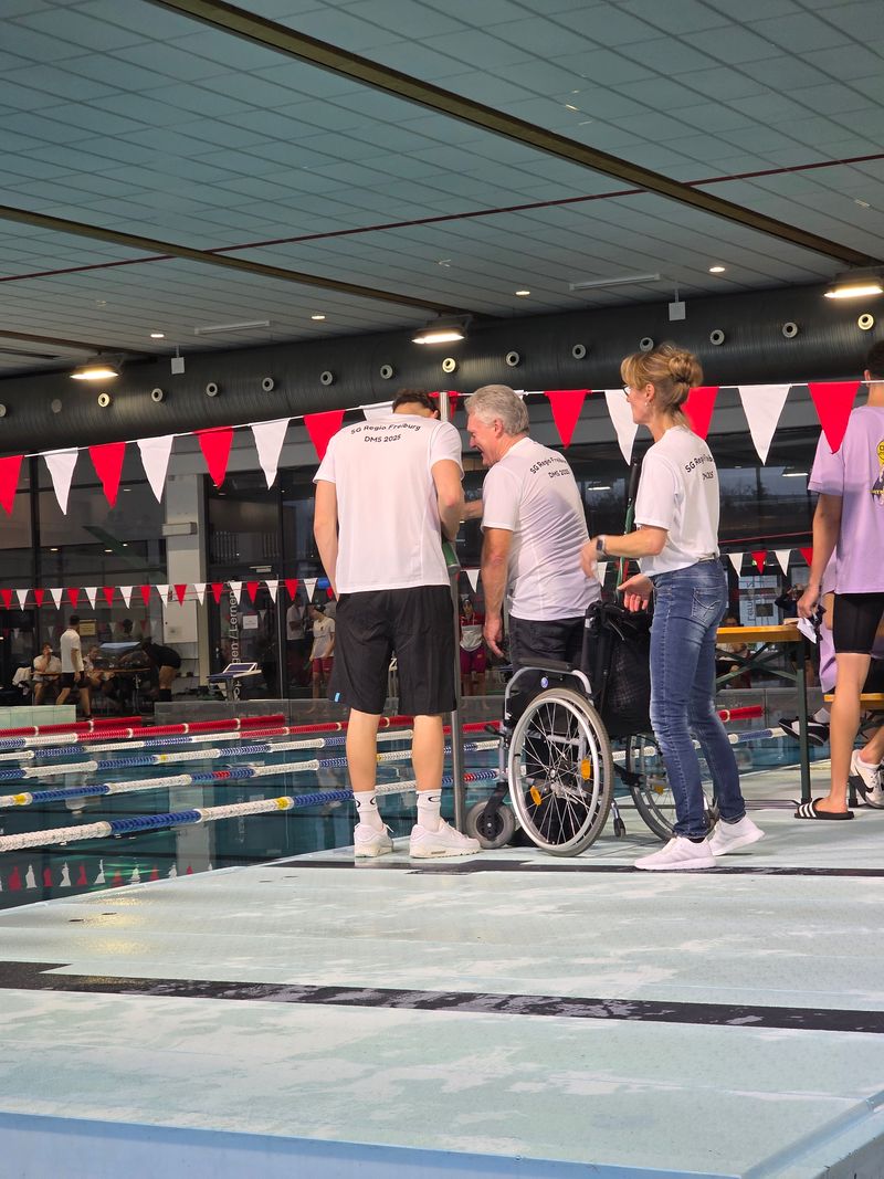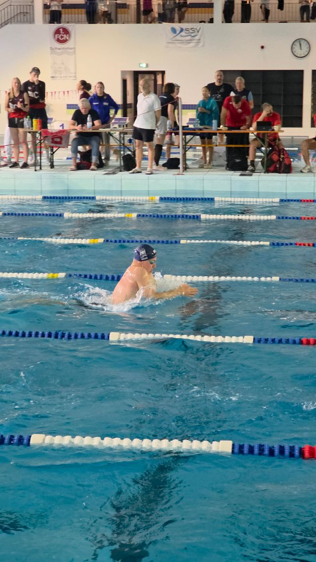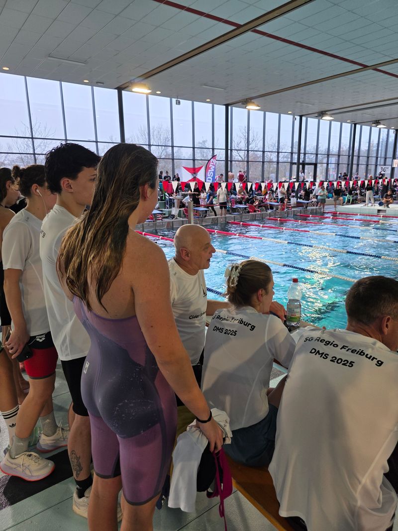Die SG Regio Freiburg war in Nürnberg nicht nur sportlich stark – sie war eine Einheit. Lautstark, kämpferisch, motiviert. Und alle freuten sich über den Besuch vom langjährigen Cheftrainer Bernd Pinkes, der mit seiner Frau Kerstin vom nahen Plauen am Freitagabend angereist war und dann – zum ersten Mal nach zwei Jahren – wieder einen Schwimmwettkampf besuchte und mit vielen bekannten Menschen nette Gespräche führte.