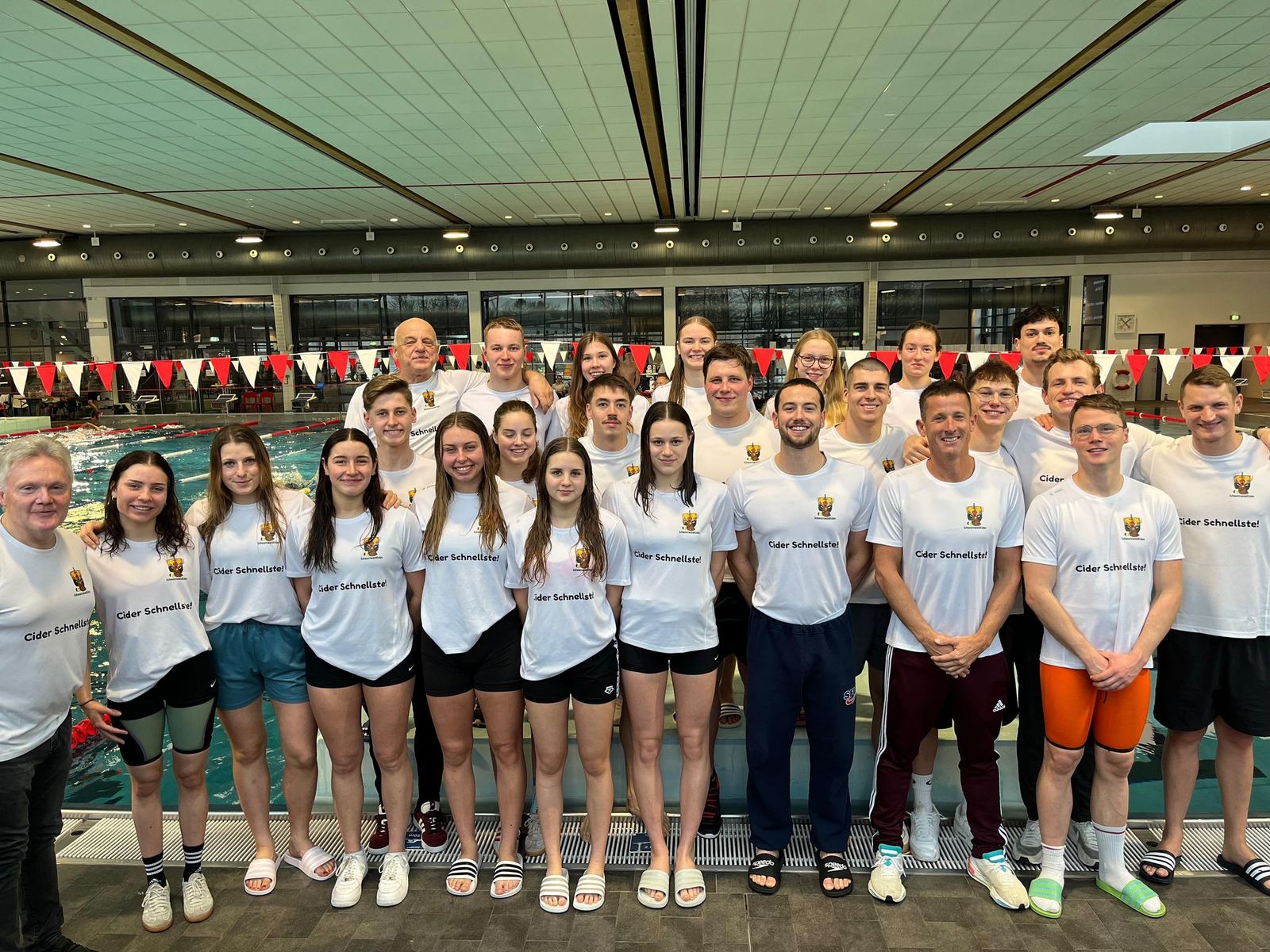 Einen starken Auftritt hatte die SG Regio Freiburg beim Deutschen Mannschaftswettbewerb Schwimmen (DMS) am vergangenen Samstag. Im Nürnberger Hallenbad Langwasser punkteten die Freiburger Athletinnen und Athleten zu Wasser und am Beckenrand. Den siebten Platz belegte sowohl das Damen- als auch das Herrenteam der SG Regio. Damit ist ganz klar: Auch 2026 wird in der 2. Bundesliga Süd mitgeschwommen. Am Beckenrand bestachen die Freiburger mit der coolsten Shirt-Aufschrift: „Cider Schnellste!“. Mitsponsor dieser Teamshirts ist die Schwarzwald Cider Manufaktur.